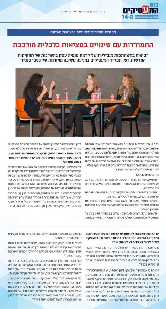 הכנס כלל נושאים מעולמות הפנסיה והגמל, הפיננסים, הבריאות, הרגולציה והבינה המלאכותית. אילה גל אבני הנחתה רב שיח בנושא "הסדרים פנסיונים במציאות משתנה" בו השתתפו ענת כנפו תבור, מנכ"לית אלטשולר שחם גמל ופנסיה ושני בלו הרפניסט, מנכ"לית הפניקס פנסיה וגמל.
